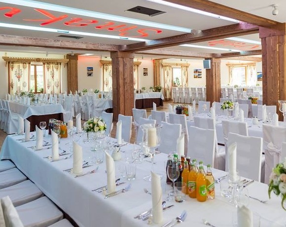 - Układ góralski, inaczej styl biesiadny – stoły dla gości są łączone. Para Młoda siedzi przy stole prezydialnym. Środek sali przeznaczony na parkiet. Dostępne są 4 bufety: wiejski, rybny, słodki i bar. Przy stołach prostokątnych można usadzić nawet 380 osób.