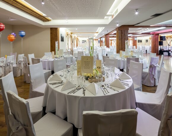 - Układ pański, czyli stoły okrągłe dla 10-12 osób. Parkiet znajduje się na środku lub początku sali. Stół prezydialny dla Pary Młodej. 4 bufety: wiejski, rybny, słodki i bar. Przy stołach okrągłych zalecana liczba gości to 230 osób, z możliwością powiększenia do 280.